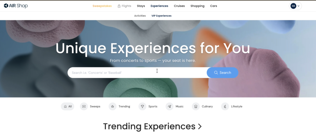 Start by browsing categories on AIR Shop. For this example, select “Experiences”, then click “VIP Experiences.”