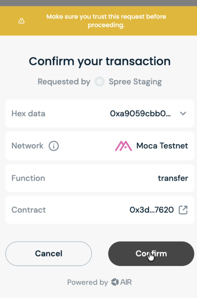 Please note: although the transaction occurs on the Moca Chain testnet, the payment is real and recorded on-chain.
