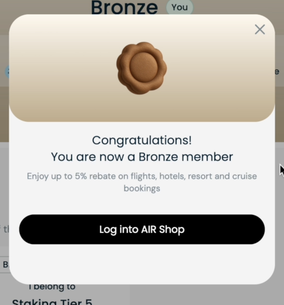 Congratulations on successfully upgrading to the Bronze Tier in AIR Shop! You are now eligible for increased returns on your purchases and access to exclusive rewards. Explore all the new perks and enjoy the benefits of your upgraded status.