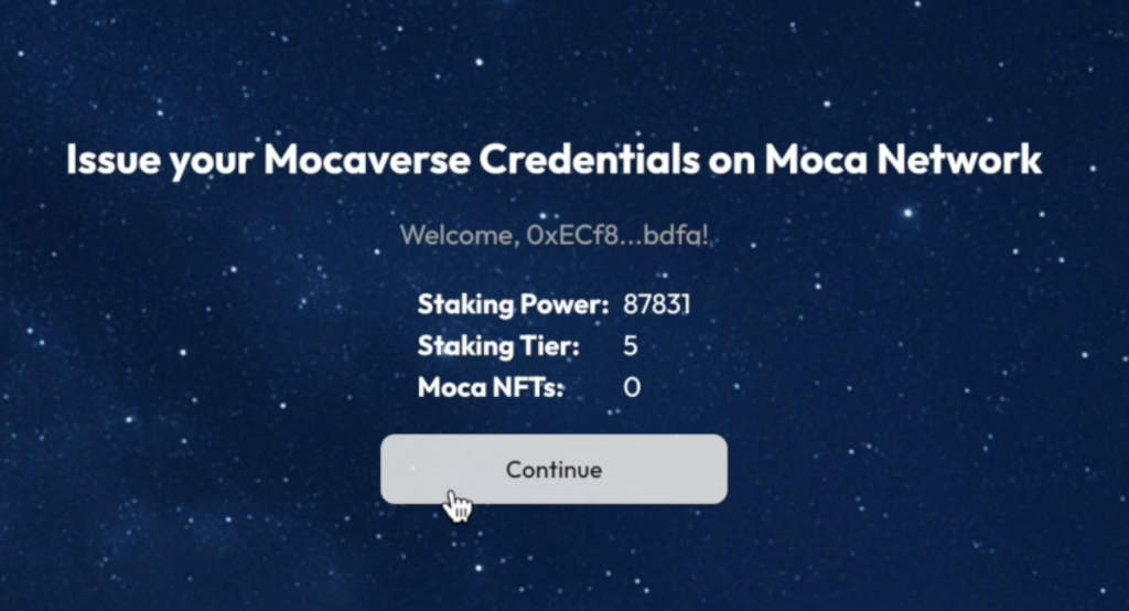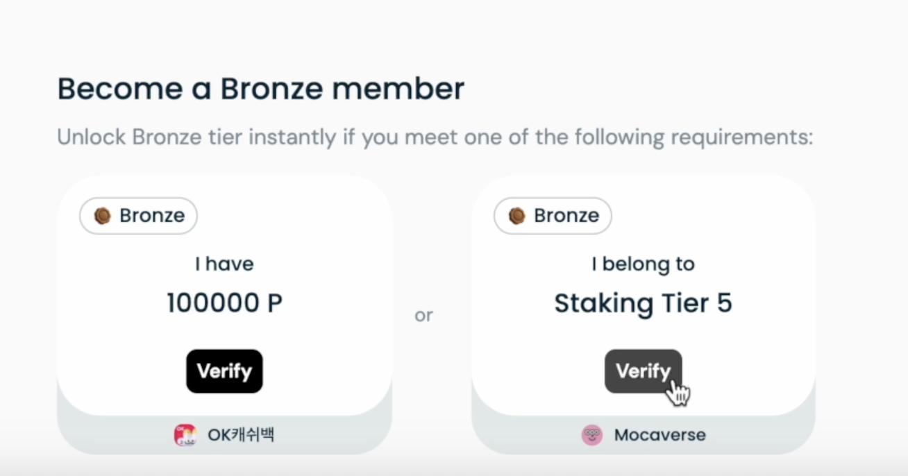 To enjoy the benefits of your chosen tier, you need to complete the verification process for one of the required credentials. In this example, we’ll verify as Staking Tier 5 of Mocaverse. Simply click on the “Verify” button to begin the verification process.