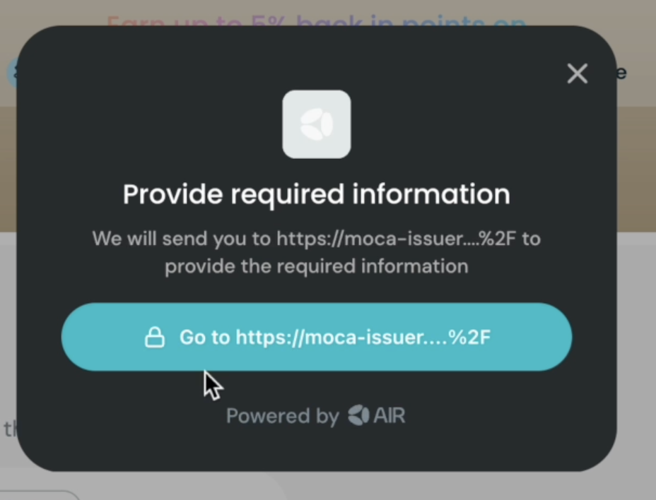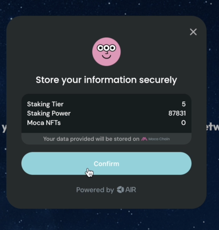 Click “Confirm” to permit AIR Shop to securely store your credential proof on Moca Chain. This ensures that your verification is properly recorded and protected within the AIR Shop ecosystem.