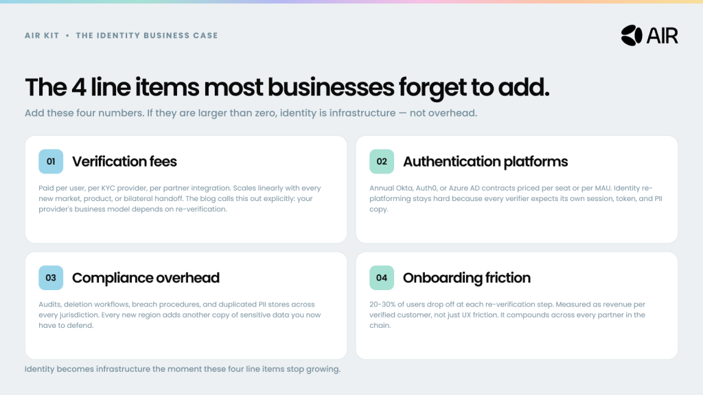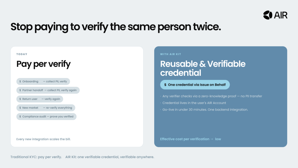 We are excited to share how the right approach to identity data eliminates operational inefficiencies while creating seamless customer experiences. The breakthrough is portable identity infrastructure that lets customers verify once and access services everywhere, without businesses storing sensitive personally identifiable information (PII). For more context on AIR, visit air3.com.